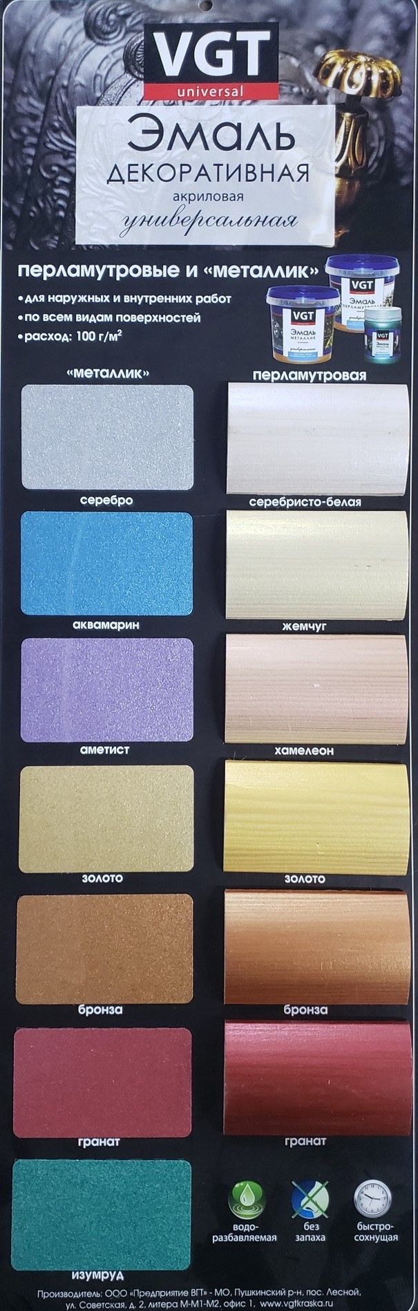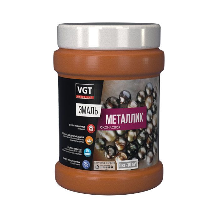 Эмаль акриловая ВД-АК-1179 Металлик  -  Акриловая эмаль с металлическим блеском для декоративной окраски практически любых поверхностей. Применяется для наружных и внутренних работ от бренда VGT-ecology material с доставкой по России!