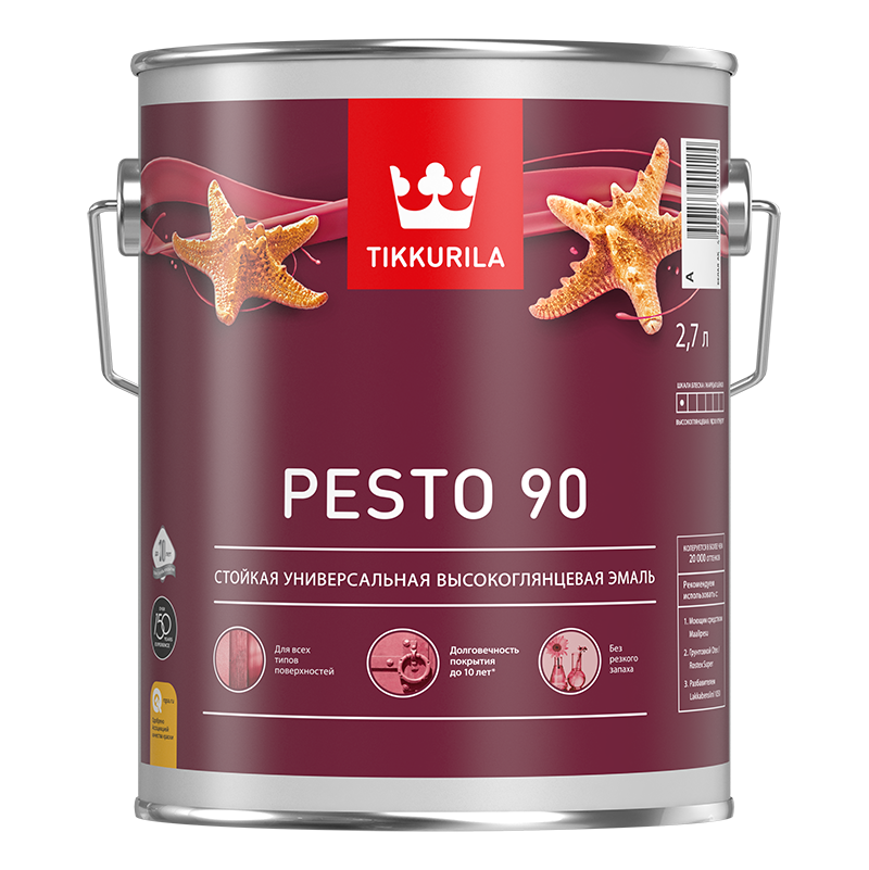 Эмаль универсальная PESTO 90 (глянц)  -  Эмаль универсальная Tikkurila PESTO 90 — это высококачественное покрытие, разработанное для обеспечения долговечности и элегантного вида поверхностей. Основана на основе алкидной смолы, эта эмаль отличается легкими оттенками растворителя, что делает её применение комфортным даже в закрытых пространствах. ПЕСТО 90 характеризуется высочайшей прочностью и гладкой, высокоглянцевой поверхностью, идеально подходящей как для наружных, так и для внутренних работ. Её универсальность позволяет использовать данное покрытие для самых разнообразных материалов: дерева, металла и бетона. Особенно хорошо подходит для отделки окон и дверей, обеспечивая их защиту от погодных условий и износа. Одним из преимуществ PESTO 90 является возможность колорирования, что позволяет подобрать идеальный оттенок для любого интерьера или экстерьера. Это делает её идеальным выбором для профессионалов и домашних мастеров, стремящихся к безупречному результату. от бренда Tikkurila с доставкой по России!