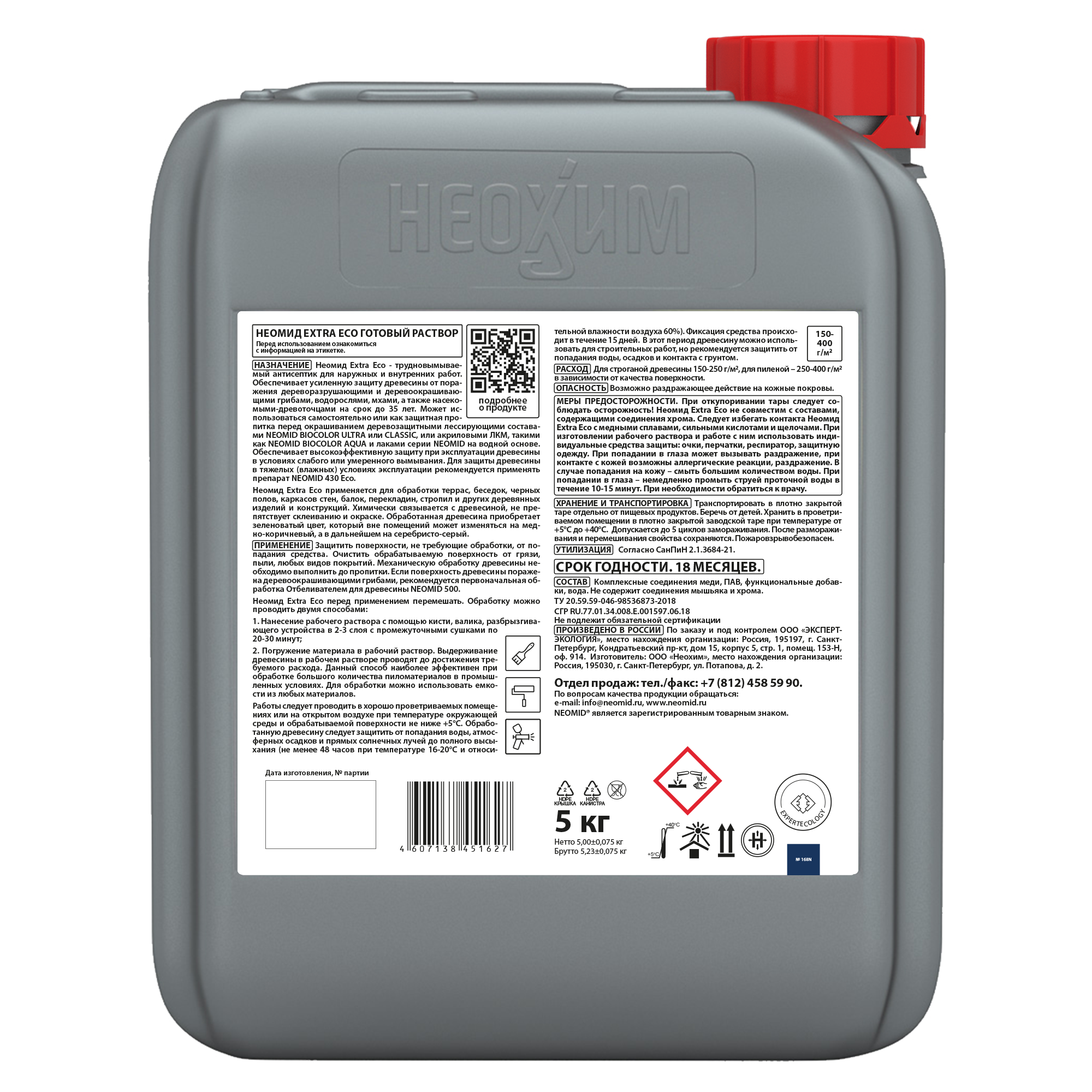 Extra Eco трудновымываемый деревозащитный состав  -  Трудновымываемый деревозащитный состав. Применяется для обработки террас, беседок, черных полов, каркасов стен, балок, перекладин, стропил и других деревянных изделий и конструкций от бренда Neomid с доставкой по России!