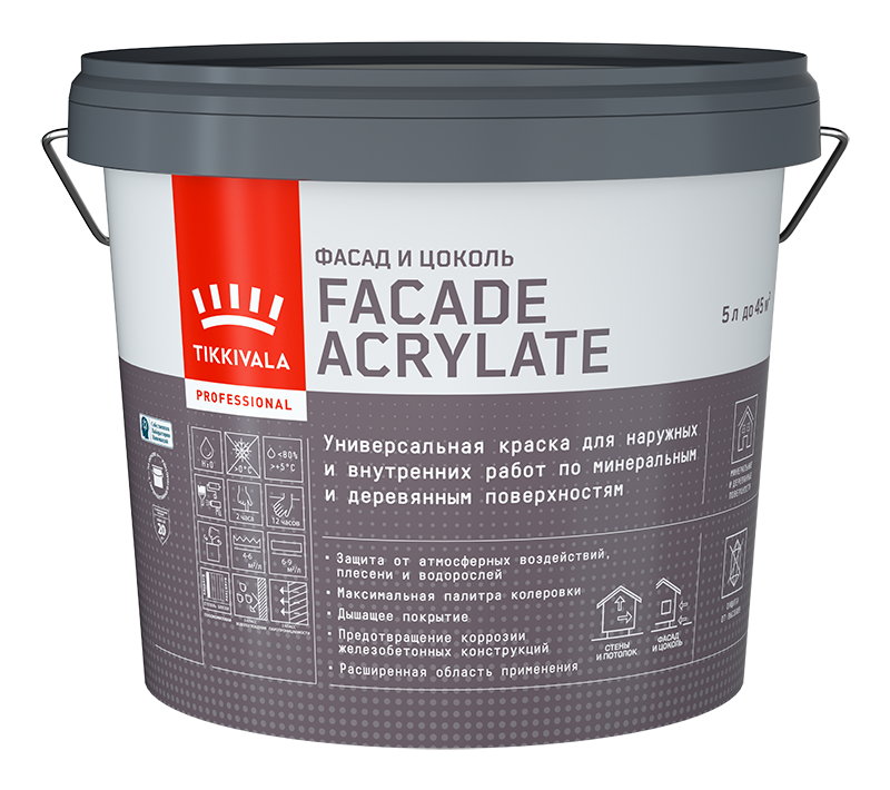 Фасадная краска Facade Acrylate (гл/мат) - Фасадная краска Tikkurila Facade Acrylate Представляем вам высококачественную фасадную краску Tikkurila Facade Acrylate — идеальный выбор для профессионалов и любителей качественного ремонта! Эта акриловая краска предназначена как для наружных, так и для внутренних работ, идеально подходит для окрашивания стен и потолков из различных материалов, включая бетон и дерево. Основные преимущества: - Экологичность: краска разработана с учетом высоких стандартов экологии, не содержит вредных веществ и безопасна для здоровья. - Без запаха: благодаря инновационным технологиям, краска не выделяет неприятных запахов, что делает процесс покраски комфортным даже в закрытых помещениях. - Глубокоматовая фактура: создает эффектный и элегантный вид поверхностей, подчеркивая их естественность и чистоту. - Колеруется: легко подбирается под любой цветовой гамму вашего интерьера или экстерьера. - Моющая способность: поверхность после нанесения краски легко очищается от загрязнений, сохраняя свежесть и блеск на долгие годы. Tikkurila Facade Acrylate — это надежное решение для создания долговечных и эстетичных покрытий, обеспечивающее защиту ваших стен и потолков от атмосферных воздействий и механических повреждений. Используйте её для обновления внешнего облика вашего дома или офиса, создавая стильный и современный дизайн. от бренда Tikkurila с доставкой по России!