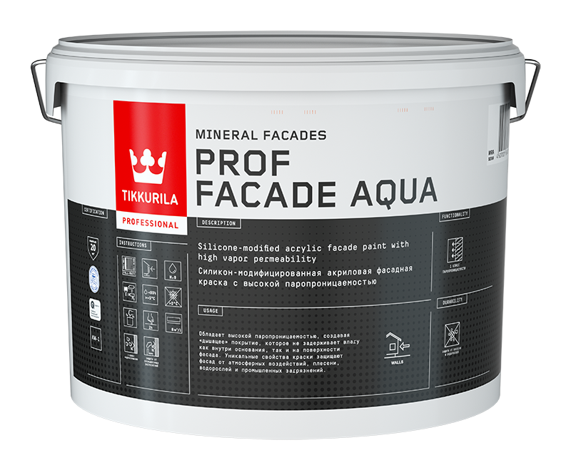 Фасадная краска PROF FACADE AQUA (мат)  -  Фасадная краска Tikkurila PROF FACADE AQUA — это высококачественное покрытие для наружных работ, разработанное для защиты и украшения внешних поверхностей зданий. Отличаясь своей силикон-модифицированной формулой, эта воднодисперсионная акриловая краска обеспечивает исключительную атмосферостойкость и долговечность, делая её идеальной для использования на стенах из бетона. Tikkurila PROF FACADE AQUA обладает уникальной паропроницаемостью, что позволяет стенам «дышать», предотвращая накопление влаги и образование конденсата. Её матовый оттенок создает элегантный и сдержанный внешний вид, идеально подходящий для любого архитектурного стиля. Без запаха и легкости в применении, эта краска обеспечивает комфортные условия работы как профессионалам, так и любителям. Гарантия стойкости цвета и защита от воздействия погодных условий делают Tikkurila PROF FACADE AQUA надежным выбором для долгосрочного и качественного покрытия фасадов. от бренда Tikkurila с доставкой по России!
