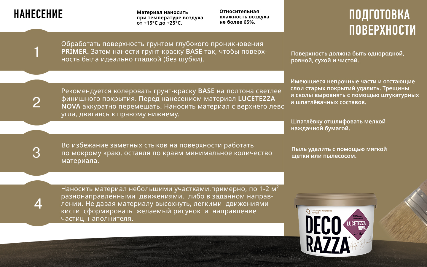 Декоративная краска Lucetezza с перламутром и кварцевыми частицами позволяет создавать запоминающиеся эффекты с переливами и переходами цвета, в том числе роскошный «Клондайк NERO» и брутальный декор «Сварные швы». Материал выпускается в 5 базах: серебро, золото, алюминий, бронза, медь, может колероваться в спокойные пастельные и яркие оттенки. Формируемое покрытие с легкой песчаной структурой устойчиво к влажной уборке, экологично, изысканно смотрится в классических и современных интерьерах фотостудий, гостиных, спален, прихожих, столовых в загородных домах, кабинетов и конференц-залов в офисах и на других объектах. Средний расход не превышает 0,2 л/м2.