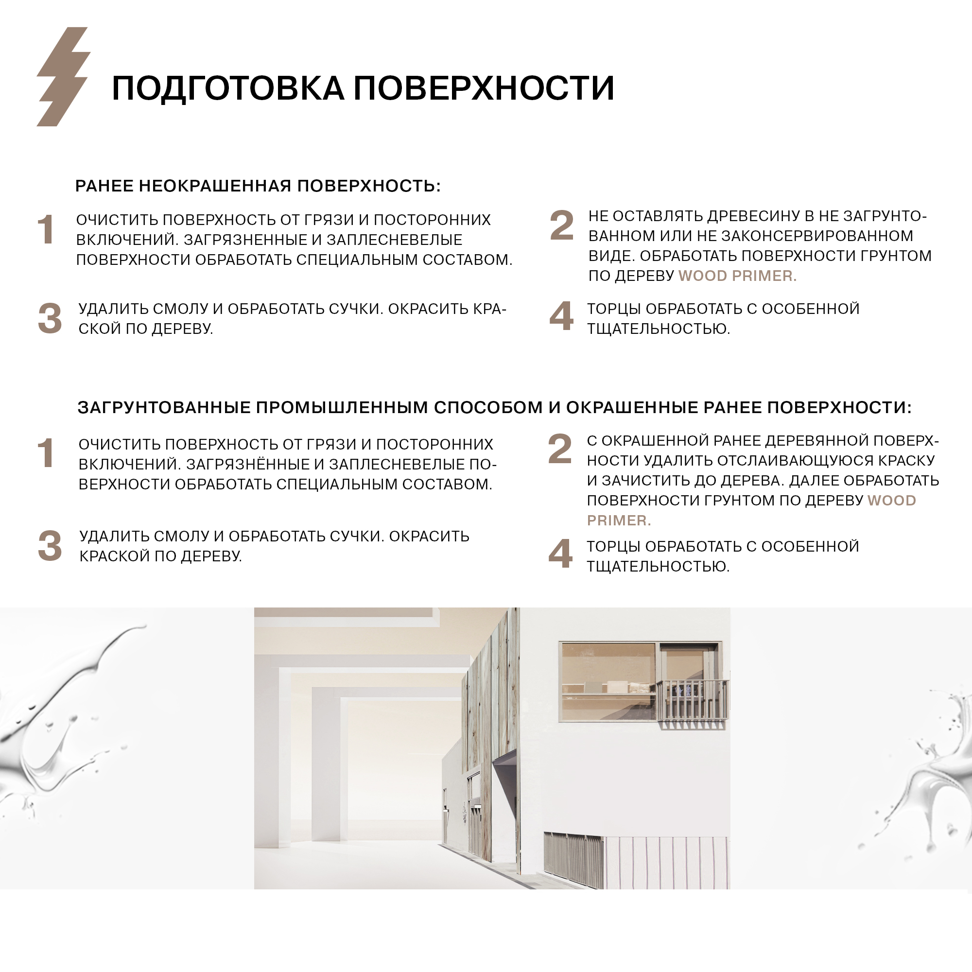 Загрунтованные промышленным способом и окрашенные ранее поверхности: очистить поверхность от грязи и посторонних включений. Загрязнённые и заплесневелые поверхности обработать специальным составом. С окрашенной ранее деревянной поверхности удалить отслаивающуюся краску и зачистить до дерева. Далее обработать поверхности грунтом по дереву Wood Primer. Удалить смолу и обработать сучки. Окрасить краской по дереву. Торцы обработать с особенной тщательностью.