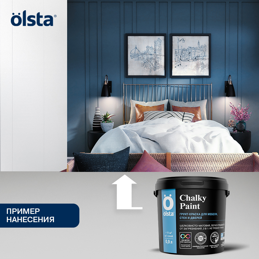 Краска для мебели меловая CHALKY PAINT  -  Краска для мебели меловая OLSTA CHALKY PAINT — это непревзойденное решение для тех, кто мечтает о стильной и долговечной мебели без лишних хлопот. Эта мебельная краска обладает уникальной матовой текстурой, напоминающей натуральный мел, что придает поверхности уютный и элегантный вид. Экологичная формула на водной основе гарантирует отсутствие неприятного запаха, делая процесс окрашивания комфортным как для вас, так и для вашего дома. OLSTA CHALKY PAINT отличается своей стойкостью к износу, обеспечивая долгие годы безупречного вида вашей мебели. Благодаря возможности колерования, вы можете подобрать идеальный оттенок под любой интерьер, создавая неповторимую атмосферу в каждом уголке вашего пространства. Используйте эту краску для обновления старых вещей или придания оригинальности новым предметам мебели, наслаждаясь безопасностью и качеством продукта, который отвечает всем современным требованиям экологии и дизайна. от бренда OLSTA с доставкой по России!