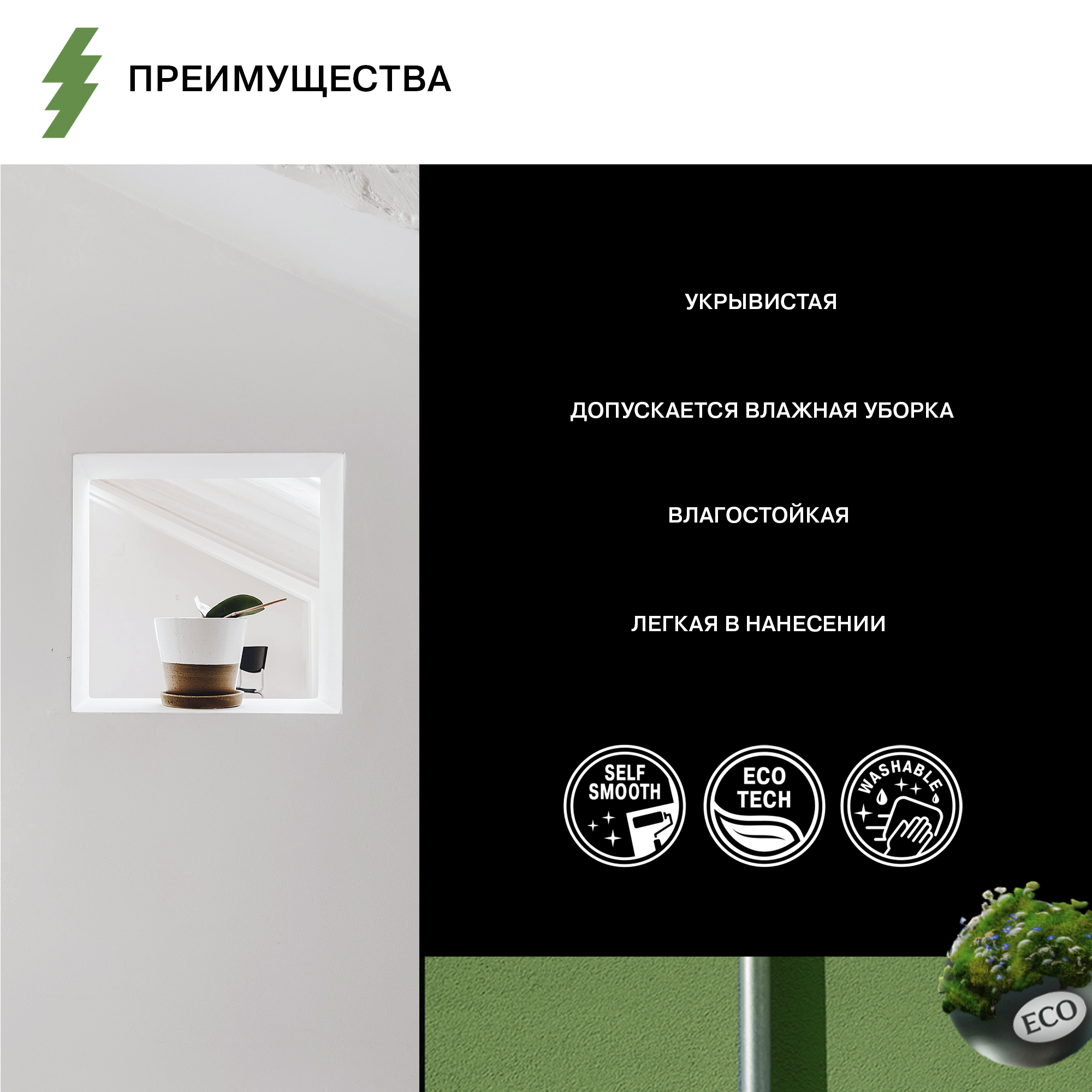 Водно-дисперсионная краска, обладающая хорошей укрывистостью, предназначена для внутренней окраски стен и потолков, а также обоев в жилых и общественных помещениях.