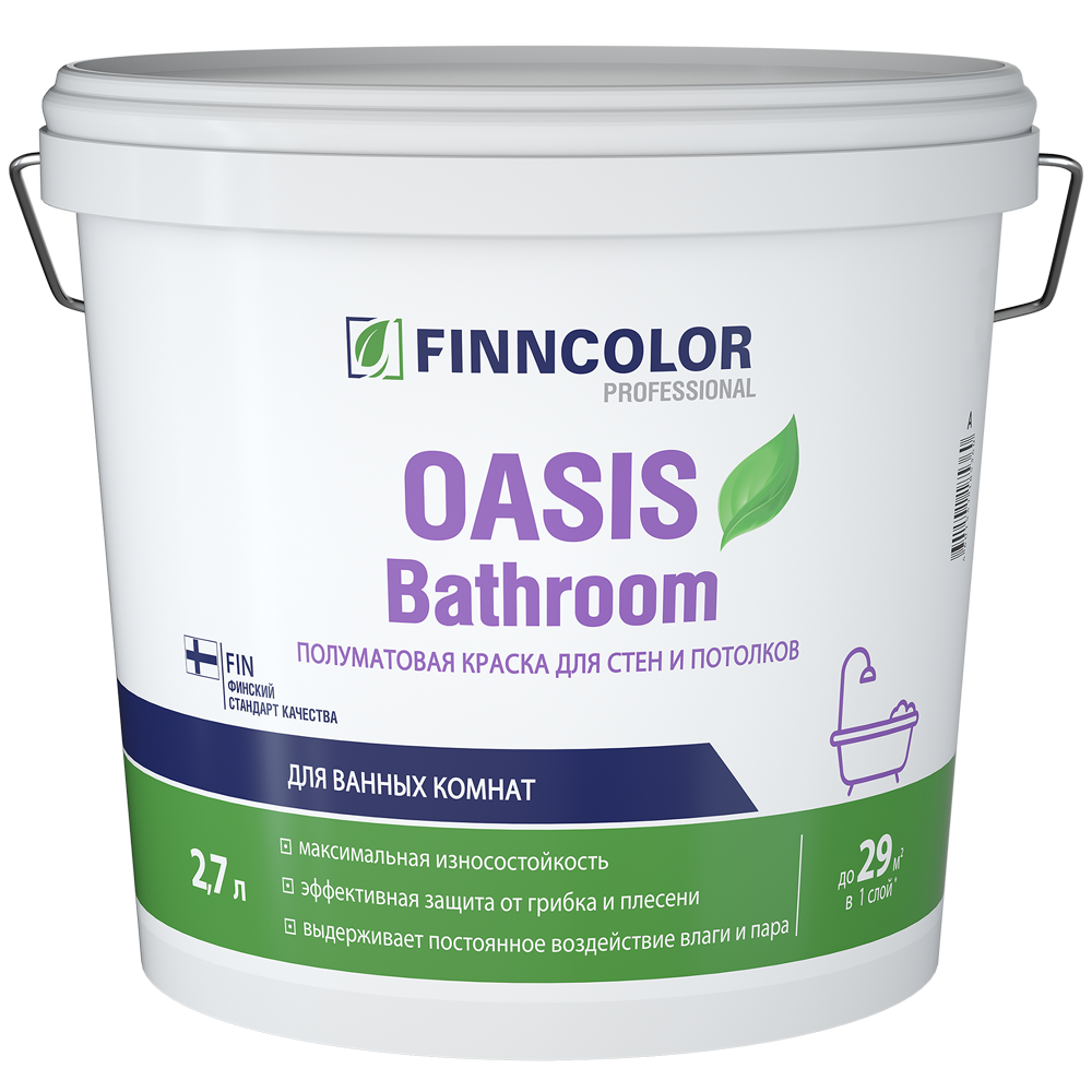 Краска для влаж. помещений OASIS BATHROOM п/мат - Высококачественная интерьерная краска. Образует полуматовое влагостойкое покрытие, содержит добавки против плесени, обладает наивысшим классом стойкости к мытью от бренда Finncolor с доставкой по России!