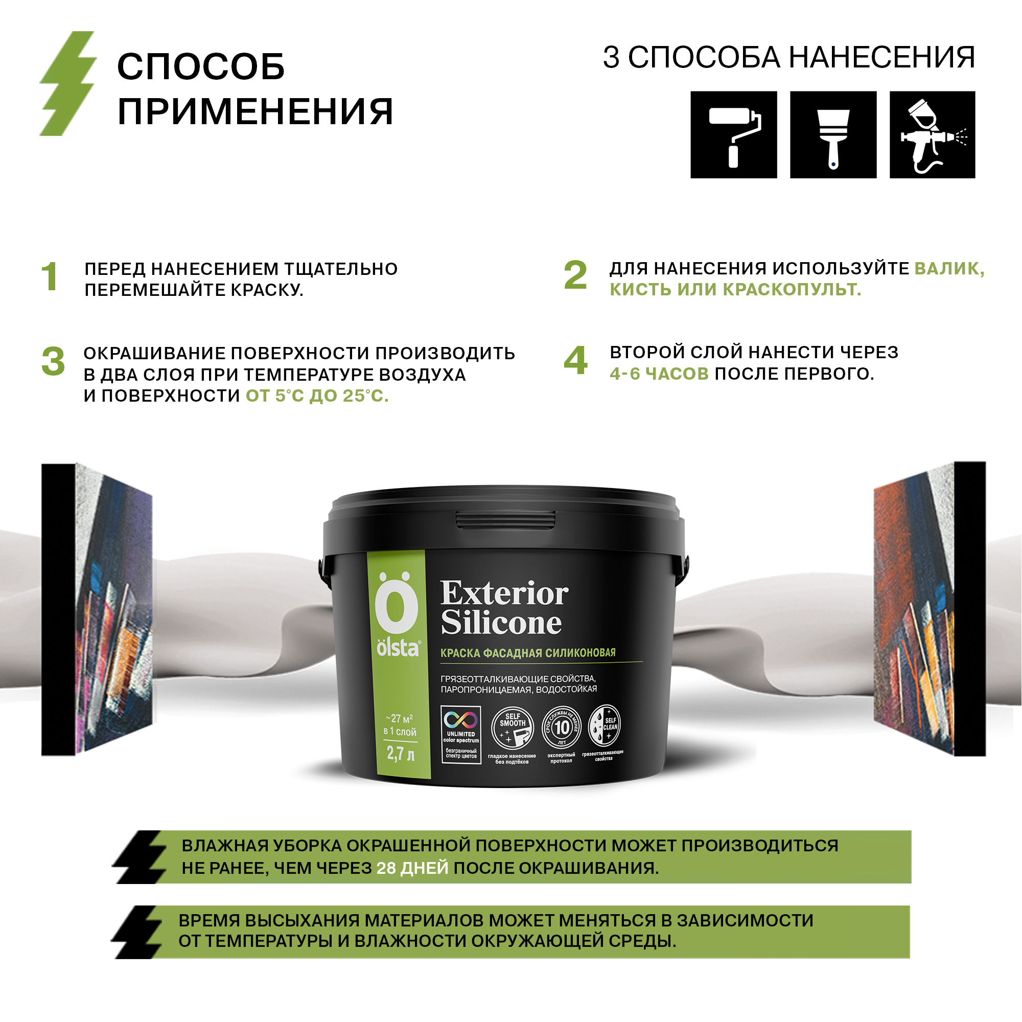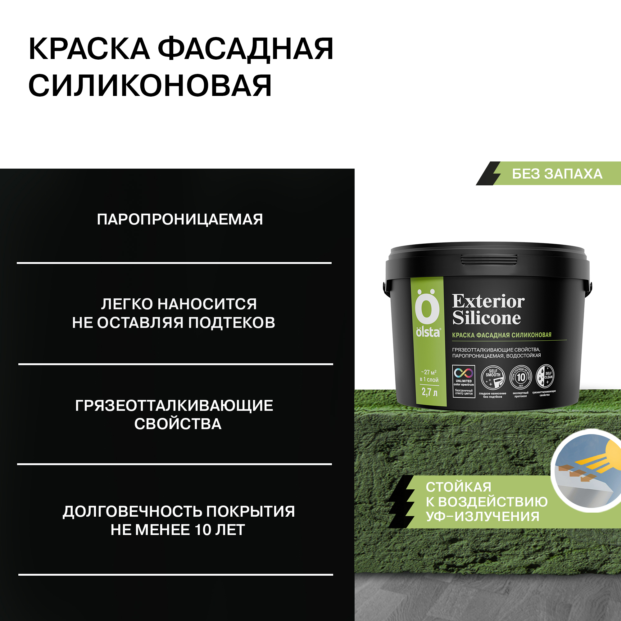 Краска фасадная EXTERIOR SILICONE - Краска фасадная OLSTA EXTERIOR SILICONE — это высококачественное покрытие, специально разработанное для защиты и украшения внешних поверхностей зданий. Благодаря своей силиконовой основе, данная воднодисперсионная краска обладает исключительными свойствами самоочищения, что обеспечивает долговечность и чистоту вашего фасада даже в сложных климатических условиях. Основные преимущества: - Атмосферостойкость: Защищает поверхность от воздействия осадков, ветра и перепадов температур. - Паропроницаемость: Обеспечивает циркуляцию воздуха, предотвращая образование конденсата и грибка. - Водостойкость: Отталкивает влагу, предохраняя стены от намокания и разрушения. - Без запаха: Создает комфортную атмосферу во время и после нанесения. - Колеруется: Предоставляет широкий спектр цветов и оттенков для индивидуального дизайна вашего дома. Краска OLSTA EXTERIOR SILICONE идеально подходит для создания эстетичного и надежного защитного слоя, который будет радовать вас своим внешним видом долгие годы. от бренда OLSTA с доставкой по России!