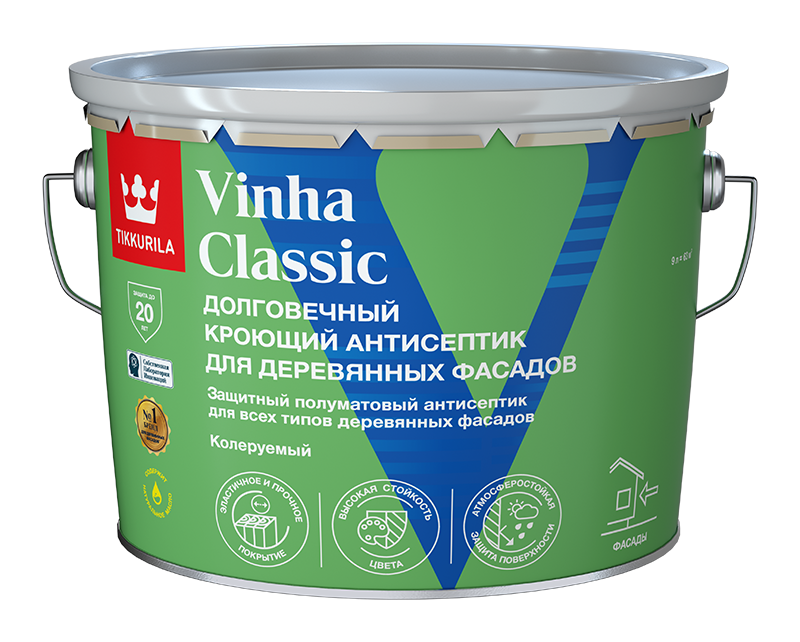 Кроющий антисептик Vinha Classic  -  Кроющий антисептик Vinha Classic — это профессиональное решение для защиты деревянных срубов и фасадных конструкций из дерева. Водоразбавляемая формула обеспечивает легкость нанесения и безопасную экологичность. Vinha Classic глубоко проникает в поры дерева, обеспечивая надежную защиту от грибков, плесени и насекомых, что особенно важно для деревянных срубов. Этот антисептик не только сохраняет природную красоту материала, но и продлевает срок службы деревянной конструкции, обеспечивая её устойчивость к внешним воздействиям природы. от бренда Tikkurila с доставкой по России!