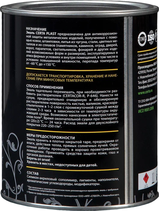 Формула CERTA на кремнийорганической основе защищает от коррозии, придает отличное сцепление с окрашиваемой поверхностью, возможность всесезонного нанесения в диапазоне −5...+30 °С. Высыхает на «отлип» за 30 минут при +20 °С.