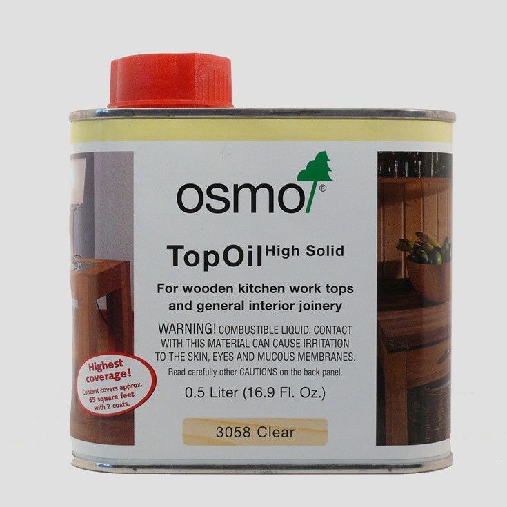 Osmo-масло с твердым воском TopOil - специальная комбинация масел и восков для бесцветной обработки кухонных столешниц, рабочих поверхностей из массива древесины и мебельных щитов. Osmo TopOil. Устойчиво к воздействию пятен от воды, вина,пива, колы, кофе, чая, соков, молока (DIN 68861-1А). Высохшее покрытие безопасно для людей, животных и растений. Устойчива к слюне и поту (DIN 53160). Подходит для детских игрушек (EN 71.3). Масло TopOil 3058 Бесцветное усиливает натуральный тон древесины (Эффект «влажной поверхности»). Масло TopOil 3068 Натур имеет противоположный эффект и защищает древесину, оставаясь практически незаметным. Натуральный тон древесины сохраняется. На темных/красноватых поверхностях масло TopOil 3068 Натур проявляется легким белым налетом. Масло TopOil 3061 Акация облагораживает древесину.