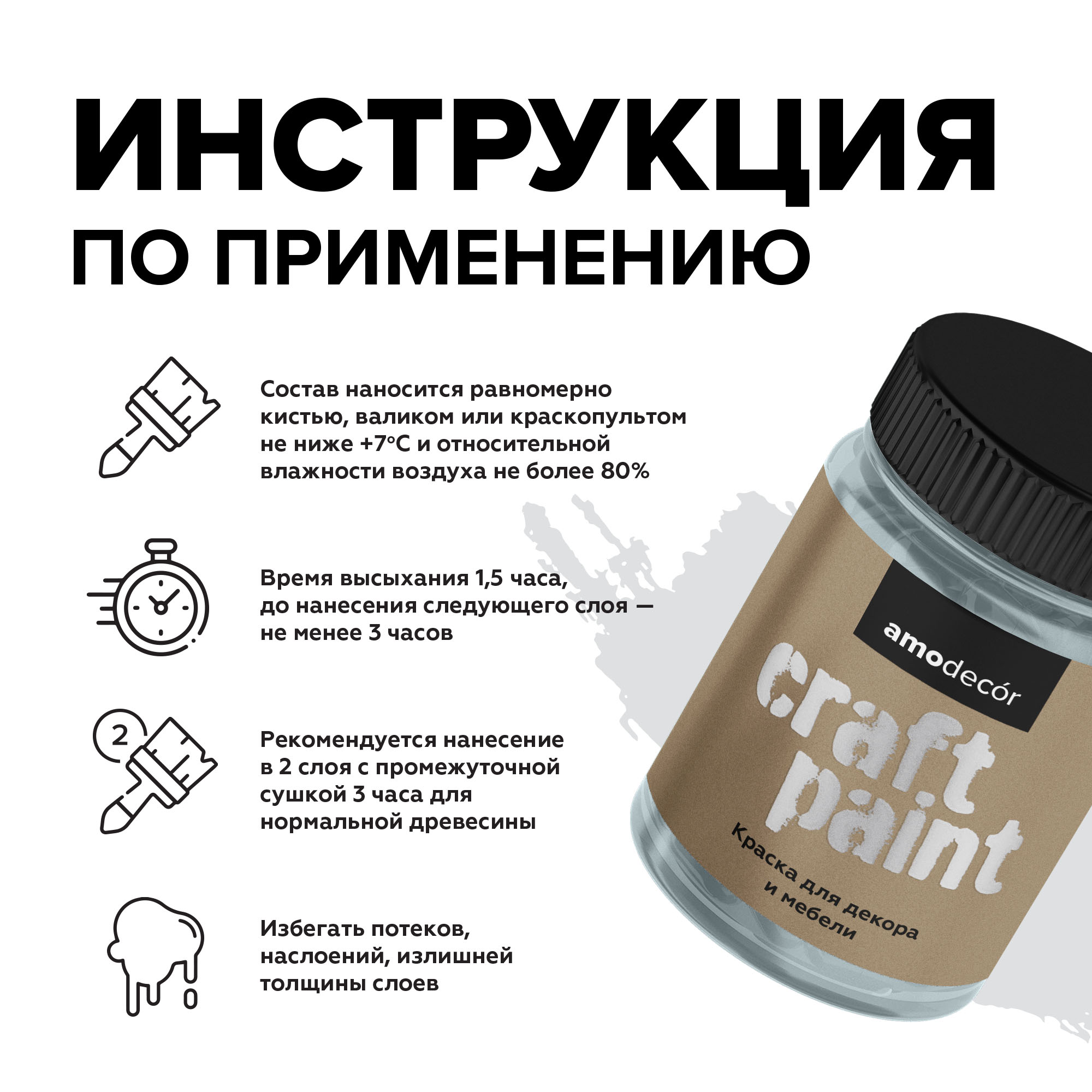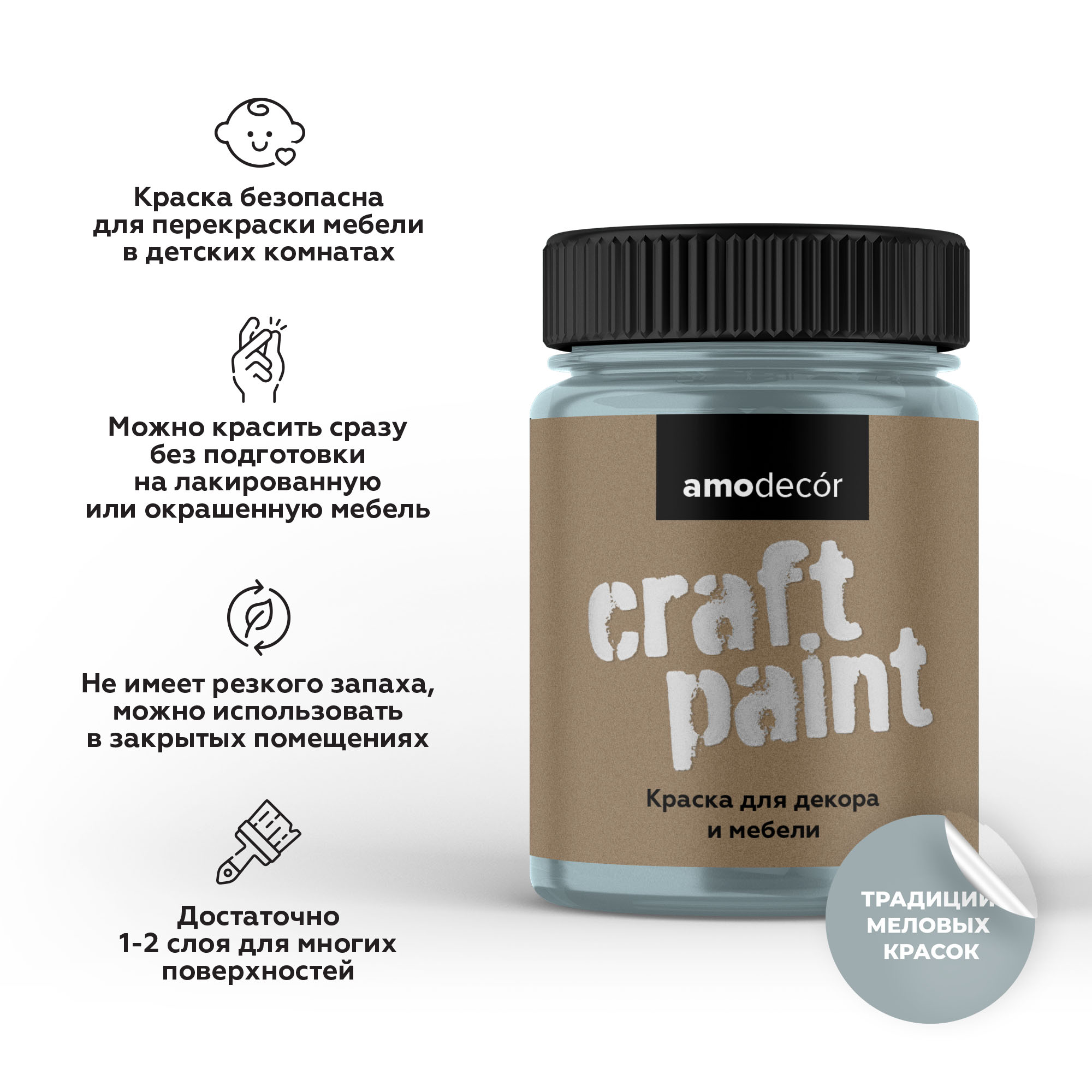 Меловая краска для мебели АМОdecor  -  Мебельная меловая краска АМОdecor — это идеальный выбор для создания уютного интерьера с акцентом на натуральность и экологичность. На водной основе, она отличается отсутствием запаха, что делает её идеальной для использования внутри помещений. Краска обладает матовой текстурой, которая добавляет мебели элегантность и глубину цвета. Благодаря своему составу, АМОdecor безопасна для здоровья и окружающей среды, обеспечивая долговечное покрытие, которое легко наносится и быстро высыхает. Её декоративные свойства позволяют преобразить любую мебель, добавляя индивидуальности и стиля в ваш дом. от бренда AMO с доставкой по России!