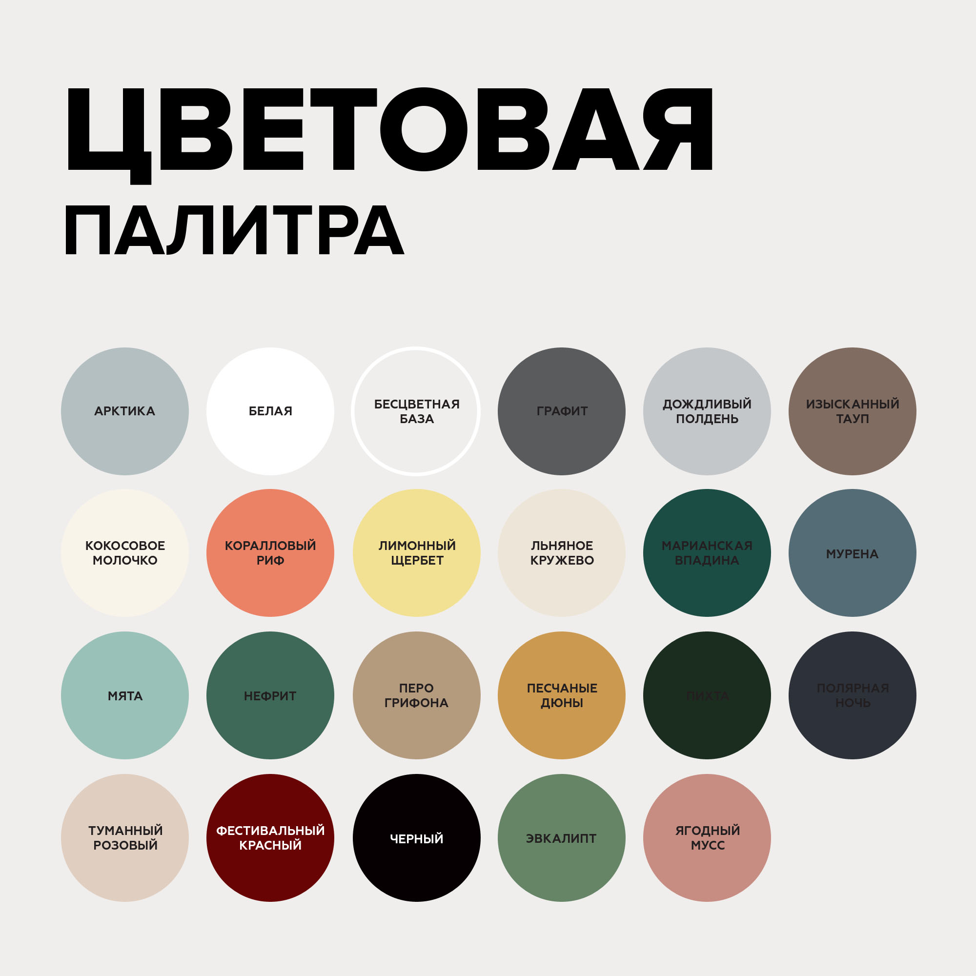 Названия цветов:  Арктика; Белый; Графит; Дождливый полдень; Изысканный тауп; Кокосовое молочко; Коралловый риф; Лимонный щербет; Льняное кружево; Марианская впадина; Мурена; Мята; Нефрит; Основа C - для колеровки в насыщенные тона; Перо грифона; Песчаные дюны; Пихта; Полярная ночь; Туманный розовый; Фестивальный красный; Черный; Эвкалипт; Ягодный мусс , компьютерная колеровка по согласованию.
