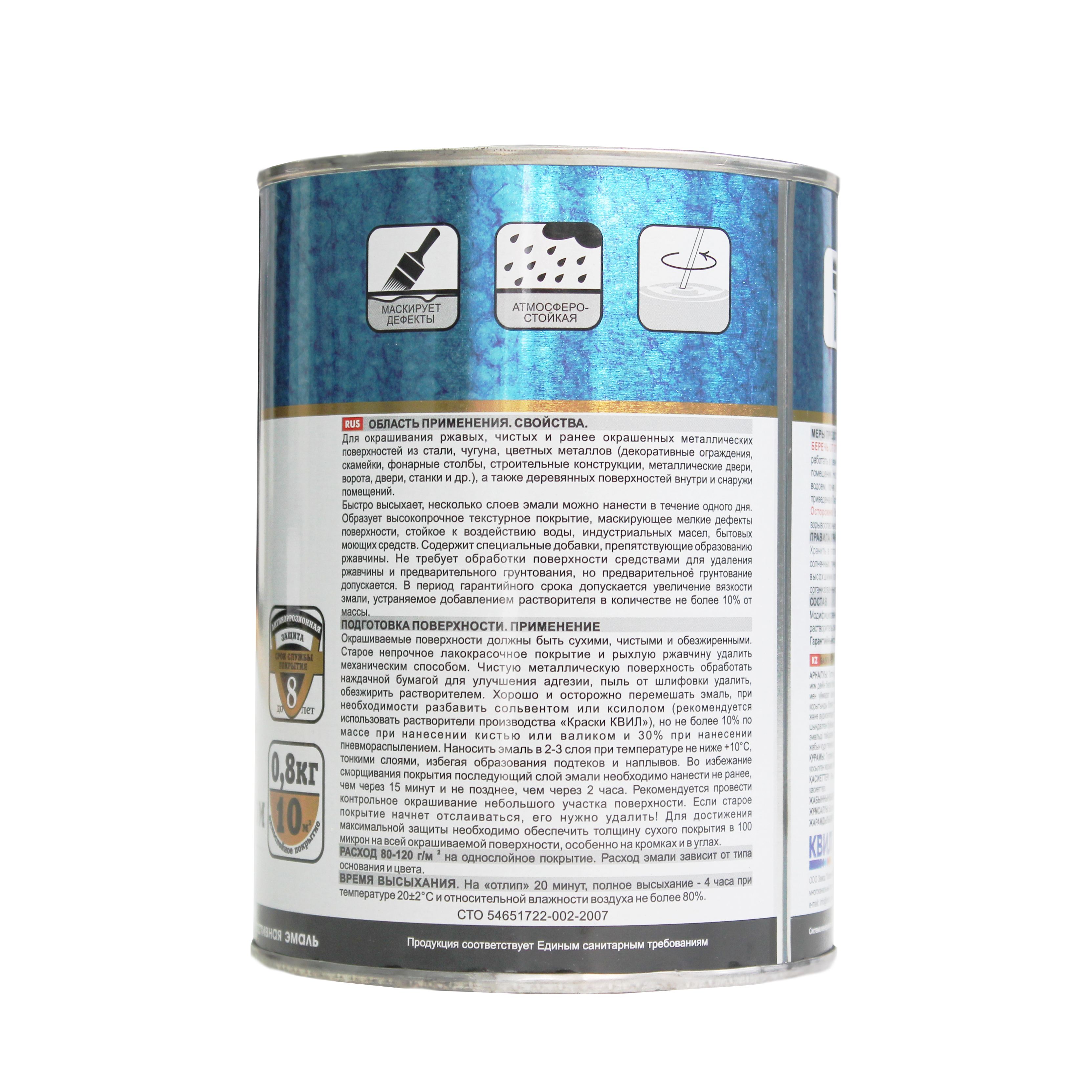 Быстро высыхает. Образует рисунчатое (молотковое) покрытие, маскирующее мелкие дефекты поверхности. Своеобразный фактурный рисунок подчеркивает красоту изделий ручной работы. Покрытие обладает высокой атмосферостойкостью, повышенной влаго- и противокоррозионной стойкостью. Применение эмали значительно упрощает подготовку поверхности перед окрашиванием и удешевляет технологию создания анти-коррозионного покрытия, т. к. не требует предварительного удаления прочно связанной ржавчины и грунтования, но предварительное грунтование допускается.