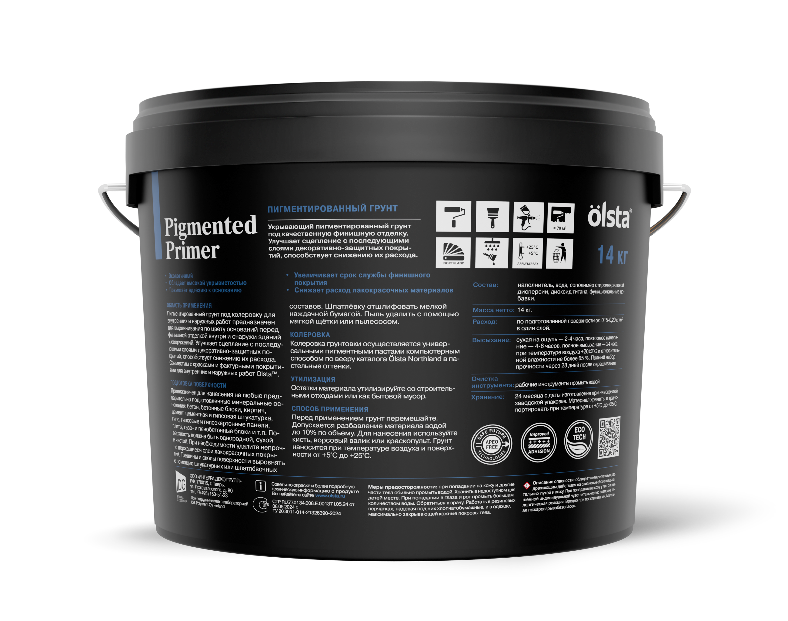 Укрывающий грунт Olsta Pigmented primer для цветового выравнивания обеспечивает качественную финишную отделку фасадов и интерьеров. Пигментированный материал хорошо укрывает основание, не оставляя темных пятен, снижает расход отделочных материалов, повышает качество сцепления с декоративными покрытиями.